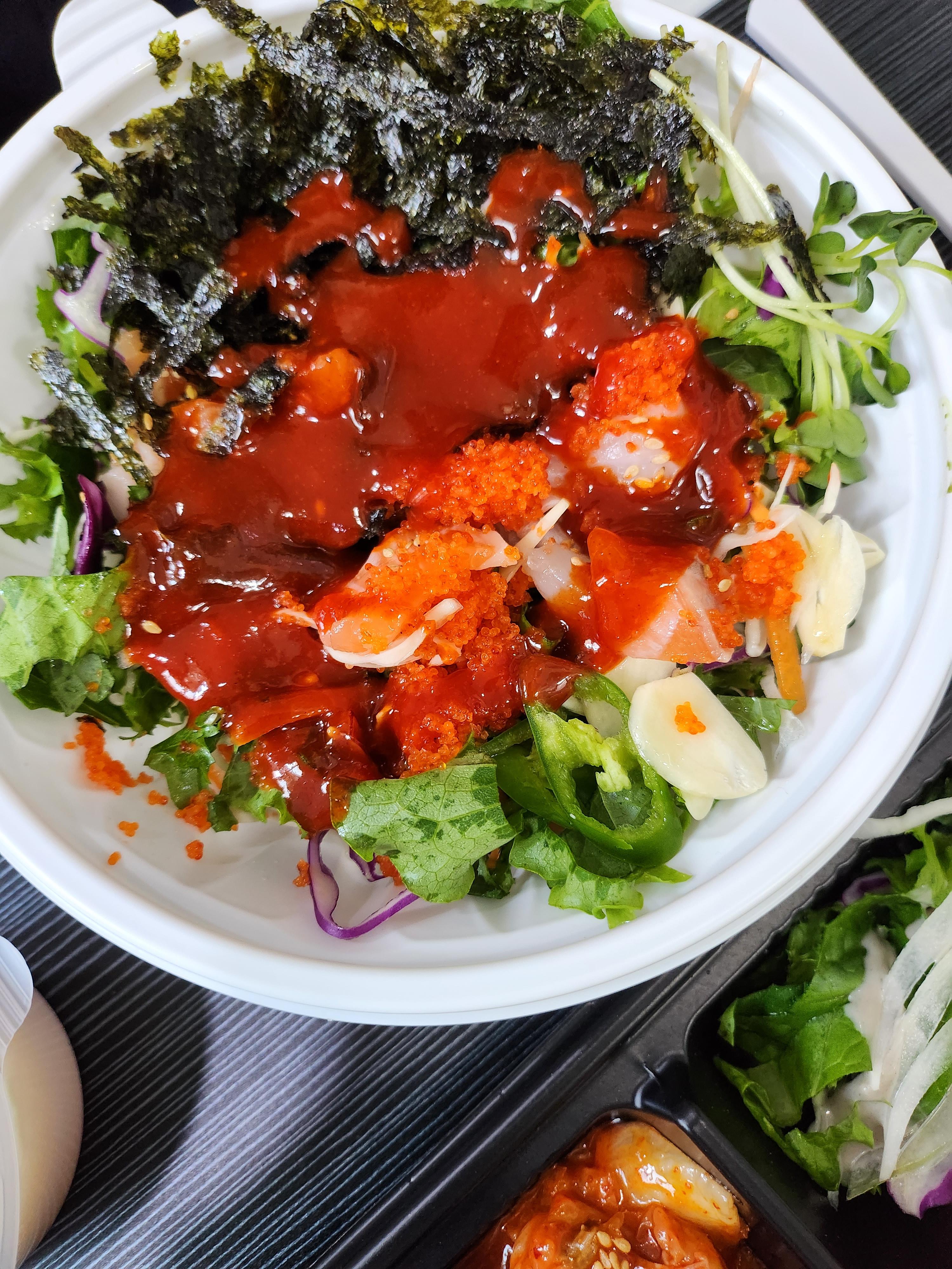 첫 번째로 소개할 메뉴는 "육회비빔밥"입니다. "무모한 초밥"에서는 신선한 육회와 다양한 야채, 계란 등을 고소하고 매콤한 고추장 소스와 함께 비빔밥으로 즐길 수 있습니다. 육회의 싱싱함과 고추장의 풍미가 어우러져 한 입 맛보면 새로운 경험을 선사합니다. 야채의 신선함과 씹을 때 느껴지는 식감도 매력적이며, 육회와 고추장의 조화로운 맛이 입 안 가득 퍼집니다.