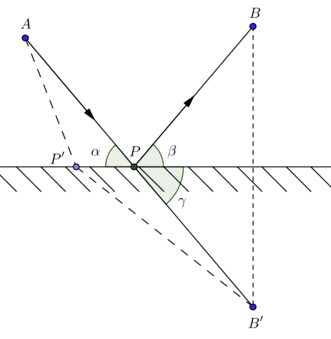 헤론의 반사 법칙(Heron's Principle of reflection)에 의하면, 빛은 빛의 경로를 최소화하는 방향으로 반사가 일어난다고 하였다. 이때 빛의 경로 길이를 광학적 경로 길이(Optical Path Length, OPL)이라고 한다. 따라서, OPL을 최소화하는 문제가 되어야 하므로 OPL $\overline{AP}+\overline{PB'}$는 최소가 되어야 한다. 따라서 $\overline{AP}+\overline{PB'}$는 직선 $\overline{AB'}$와 같다.